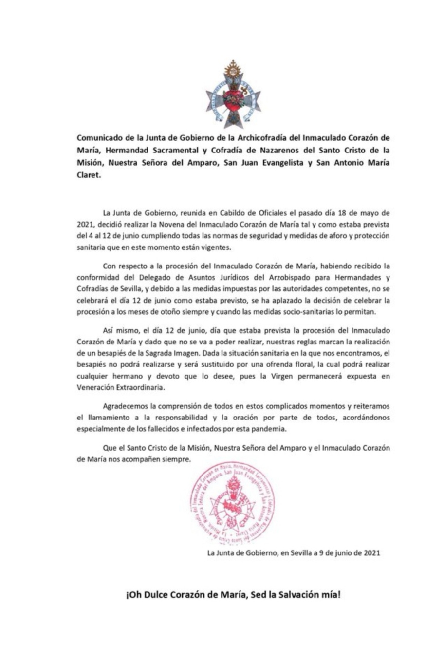 La Hermandad de la Misión reunida ha decidido aplazar la Salida Procesional de su Imagen Gloriosa, el Inmaculado Corazón de María, salida prevista para el 12 de Junio.