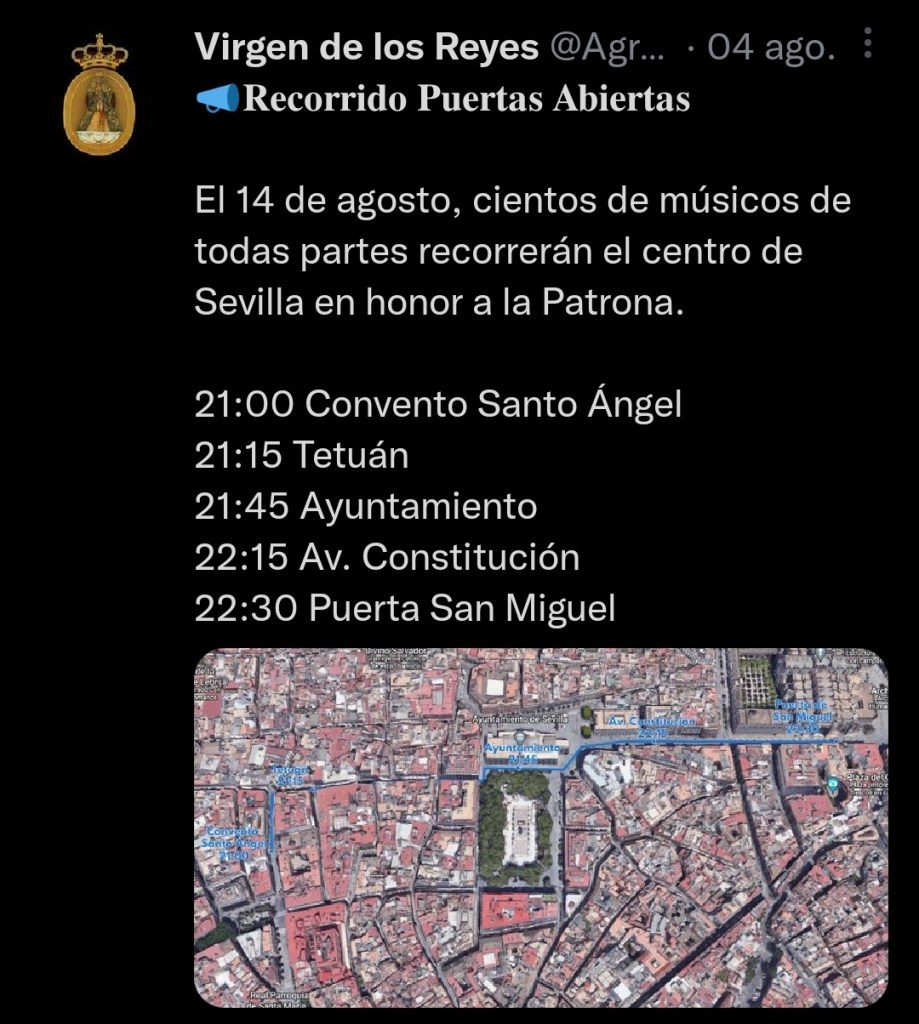 El día 14 de Agosto en Sevilla sucederá algo histórico en la formación Virgen de los Reyes, ya que se celebrará las primeras jornadas de puertas abiertas y será en un bando anunciador en las Vísperas de la Festividad de la Virgen de los Reyes patrona de nuestra Archidiócesis y de Sevilla.