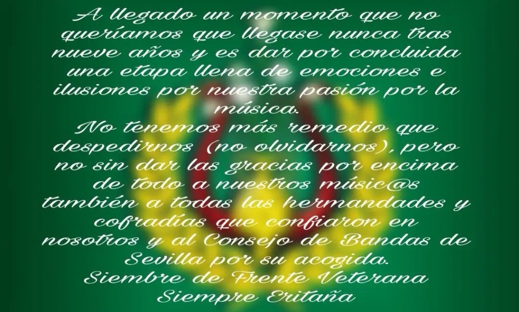 En el día de ayer, conocíamos la notícia de la extinción de la Agrupación Musical Veterana de Sevilla tras nueve años de trayectoria en el panorama musical cofrade de nuestra ciudad, destacando por su peculiar estilo, de antaño.