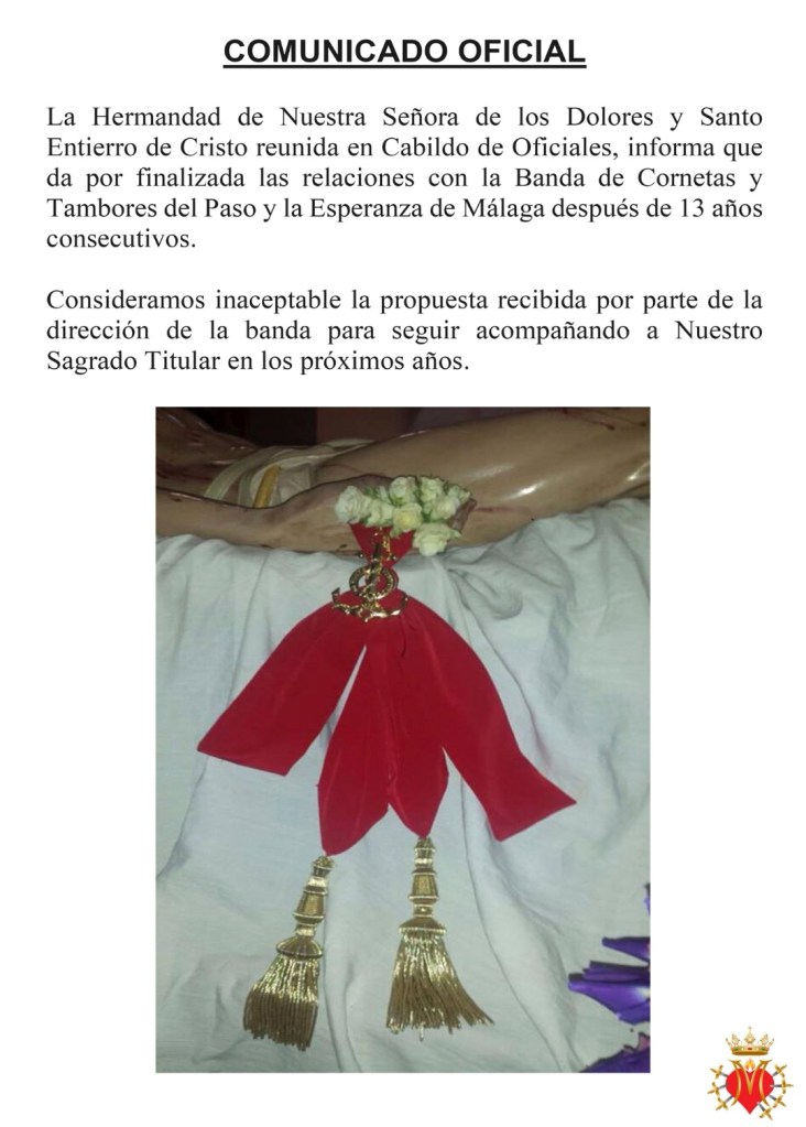 La pasada noche del domingo 16 de octubre, la Hermandad del Santo Entierro de Pedrera publicó un comunicado en el que anunciaba la no renovación de la Banda de Cornetas y Tambores del Paso y Esperanza de Málaga para el próximo Sábado Santo de 2023. El comunicado no se queda ahí, citamos palabras textuales de la propia hermandad: «Consideramos inaceptable la propuesta recibida por parte de la dirección de la banda para seguir acompañando a Nuestro Sagrado Titular los próximos años«